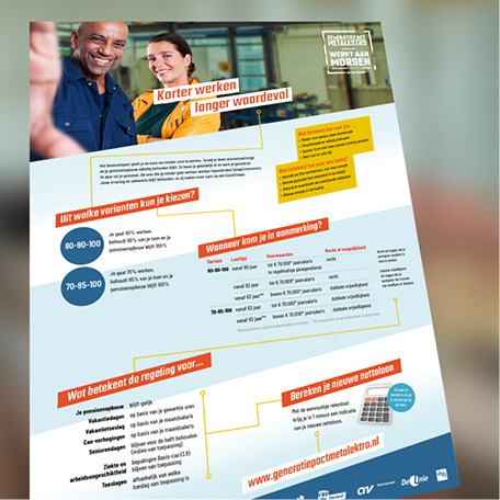This brochure explains in 4 steps how the Generation Pact works, when employees are eligible for participation and what you, as employer, can do. It also describes the most important conditions of the scheme and what the Generation Pact means for pension, vacation days, allowances, etc.